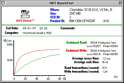 The drive used was a new IBM SCSI drive (OEM DFHSS4F 4.2 Gb. Ultrastar XP) connected to the external bus of a Quadra 900. All the following tests where done using System 7.5 (which contains SCSI Manager 4.3). I initialized the disk with various utilities and then did some benchmark tests.