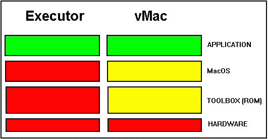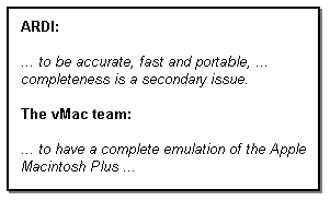 There are a number of other noteworthy differences. Ardi is a commercial company and vMac is developed as freeware by a group of very competent people. There are MSDOS, WIN32S, Linux and NeXTStep versions available of Executor; vMac comes for a couple of operating systems more, like OS/2. vMac is more portable since less code has to be adapted between ports.