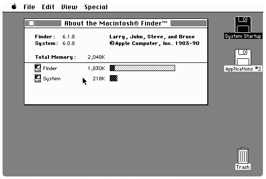 vMac is less of a technical feat. The processor emulation is static and therefore slow. (A project to make it faster is underway.) It also only emulates a 68000. It requires System 6.0.8 and the ROMs of a Macintosh Plus. This implies that in essence vMac emulates the hardware and serves as the 'glue' between the hardware, the ROM file and System 6.0.8, however it does a rather good job at this. Ofcourse because it uses more (an awful lot more) Apple copyrighted software, the look-and-feel are more Macintosh like. For instance the Finder is ofcourse fully supported. vMac does not allow all applications to run since a lot of serious applications require a processor later than the 68000. A fast Pentium is required to match the speed of a Macintosh plus. Whether it is legal to use Apple's MacOS and ROMs to run vMac on a PC is debatable.