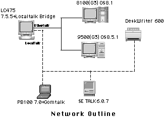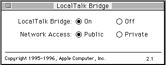 Localtalk BridgeはLocaltalk によるネットワークと他のネットワーク、たとえばEther, Token RIng or 赤外線ネットワークをブリッジ、つまり橋渡しするソフトです。Localtalk BridgeはLocalTalk Networkのみしか持っていない古いPowerbookやLaserWriterなどのプリンターと他のネットワークをつなぐものです。