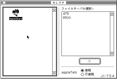 6. Appleshareをクリックしても、Localtalkのマシンが見えない場合には、時間的な遅れも有りますので、一度セレクタを閉じて、再度Appleshareを起動してみて下さい。